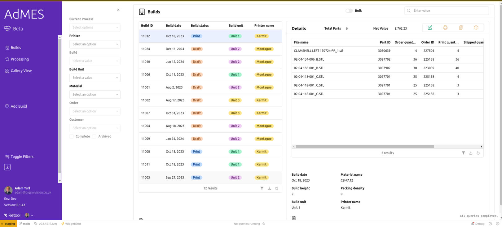 adMES is a comprehensive Manufacturing Execution System purpose-built for the 3D printing and additive manufacturing industry. Working with an existing bureau, we've developed a solution that transforms production management beyond traditional spreadsheets and manual tracking. From build preparation through post-processing stages like finishing and quality control, to final delivery and invoicing, our software provides an integrated platform that streamlines your entire manufacturing workflow.